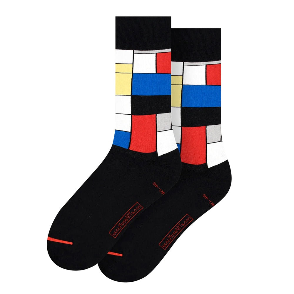 Mondrian Composition Socks in black, featuring a geometric pattern of red, yellow, blue, black, grey, and white rectangles inspired by Piet Mondrian’s abstract art style.