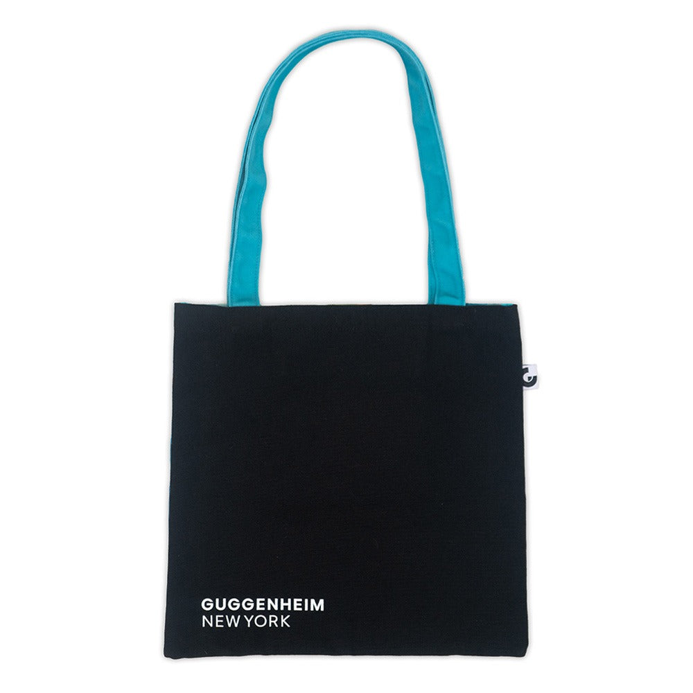 The Guggenheim Richard Hamilton Tote Bag is a black cotton canvas tote with light blue handles, measuring 16x13 inches, and features "Guggenheim New York" in white text at the bottom corner.